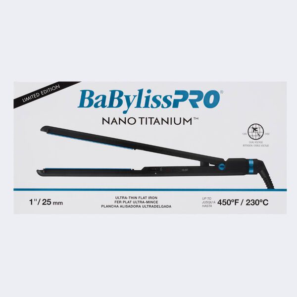 BaBylissPRO® Nano Titanium™ 1" Flat Irons evenly distribute high heat up to 450°F to create versatile styles with radiant shine. The slim design is ultra-lightweight for maximum comfort, with extended plates for faster straightening.