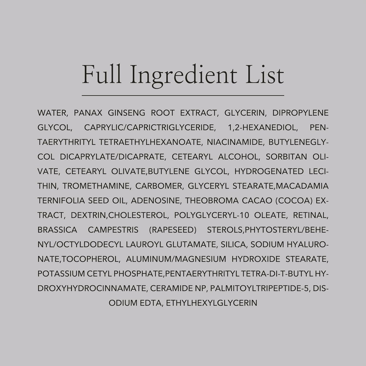 Water, Glycerin, Dipropylene Glycol, Caprylic/Capric Triglyceride, 1,2-Hexanediol, Butylene Glycol Dicaprylate/Dicaprate, Niacinamide, Pentaerythrityl Tetraethylhexanoate, Cetearyl Alcohol, Cetearyl Olivate, Sorbitan Olivate, Butylene Glycol, Hydrogenated Lecithin, Panax Ginseng Root Extract, Carbomer, Glyceryl Stearate, Tromethamine, Macadamia Ternifolia Seed Oil, Ethylhexylglycerin, Adenosine, Cholesterol, Dextrin, Polyglyceryl-10 Oleate, Theobroma Cacao (Cocoa) Extract, Disodium Edta, Brassica Campestris (Rapeseed) Sterols, Phytosteryl/Behenyl/Octyldodecyl Lauroyl Glutamate, Retinal, Silica, Aluminum/Magnesium Hydroxide Stearate, Sodium Hyaluronate, Tocopherol, Potassium Cetyl Phosphate, Pentaerythrityl Tetra-Di-T-Butyl Hydroxyhydrocinnamate, Ceramide Np, Palmitoyl Tripeptide-5