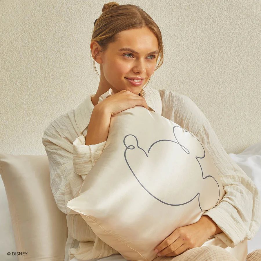 Get some beauty sleep with this satin pillowcase featuring playful line drawings of your best friends, Mickey and Minnie