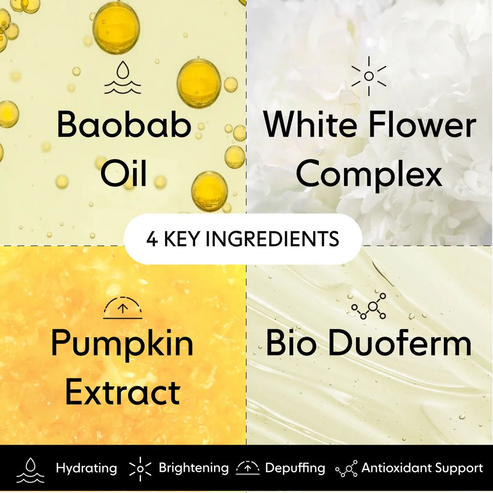 Water (Aqua/Eau), Glycerin, Propanediol, Ceratonia Siliqua (Carob) Gum, Chondrus Crispus Powder, Hydroxyacetophenone, Hydroxyethyl Urea, Chlorphenesin, Allantoin, Cellulose Gum, Glucomannan, Panthenol, Xanthan Gum, Disodium EDTA, Potassium Chloride, Sodium Polyacrylate, Dipotassium Glycyrrhizate, Dextrin, Ethylhexylglycerin, Adansonia Digitata Seed Oil, Lactobacillus Ferment, Saccharomyces Ferment Filtrate, Tocopherol, 1,2-Hexanediol, Butylene Glycol, Cucurbita Pepo (Pumpkin) Fruit Extract, Jasminum Officinale (Jasmine) Flower Extract, Nelumbo Nucifera Flower Extract, Phenoxyethanol, Freesia Refracta Extract, Iris Versicolor Extract, Leontopodium Alpinum Extract, Lilium Candidum Bulb Extract, Narcissus Pseudonarcissus (Daffodil) Flower Extract, Rosa Damascena Flower Extract, Caprylyl Glycol, Iron Oxides (CI 77492)