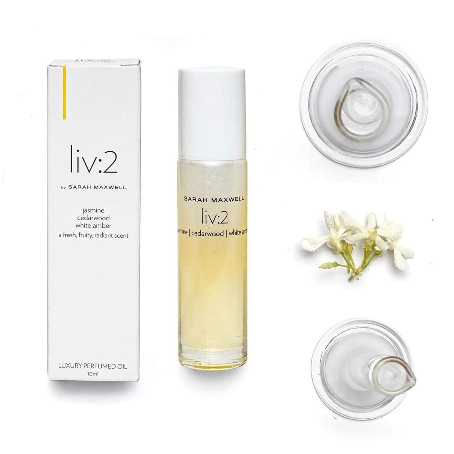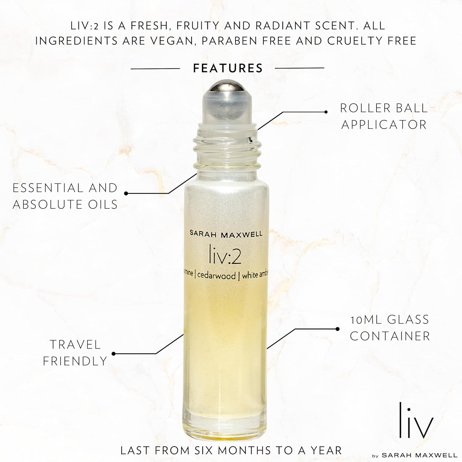 - FRESH, FRUITY, RADIANT SCENT – Overly sweet or citrus-heavy scents can feel synthetic or overly sharp. Sarah Maxwell Beauty liv:2 offers a more balanced take on freshness using jasmine, cedarwood and white amber to create a lightweight, crisp, yet structured fragrance. It opens with clean, airy, uplifting floral tones and finishes with a subtle, creamy, resinous woody base that stays fresh for hours. Just a few swipes deliver a long-wearing scent that lasts from 6 months to a full year.
