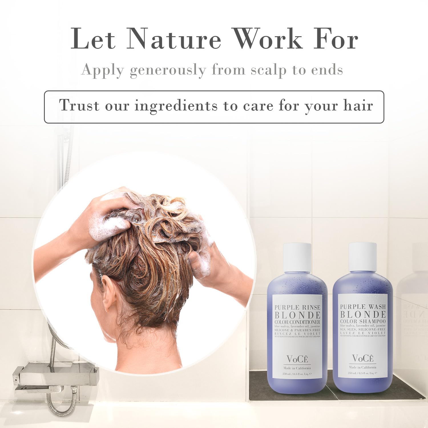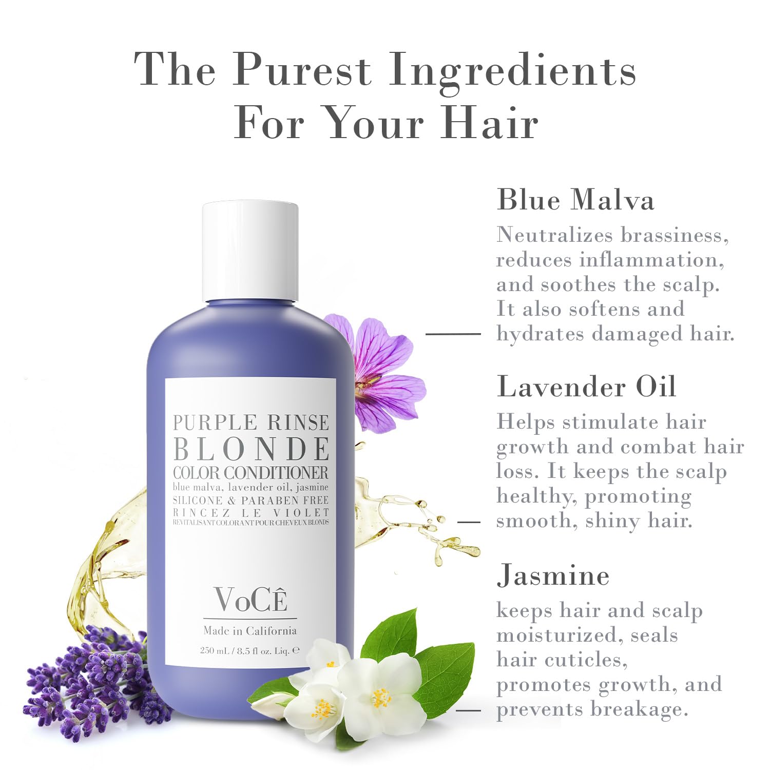 VoCe's blonde conditioner neutralizes brassiness and enhances tone for brighter hair. Formulated with mild surfactants and highly concentrated purple pigments and blue malva that counteract yellow and brassy tones while nourishing lavender oil and jasmine moisturizes, smooths, and adds brilliant shine.